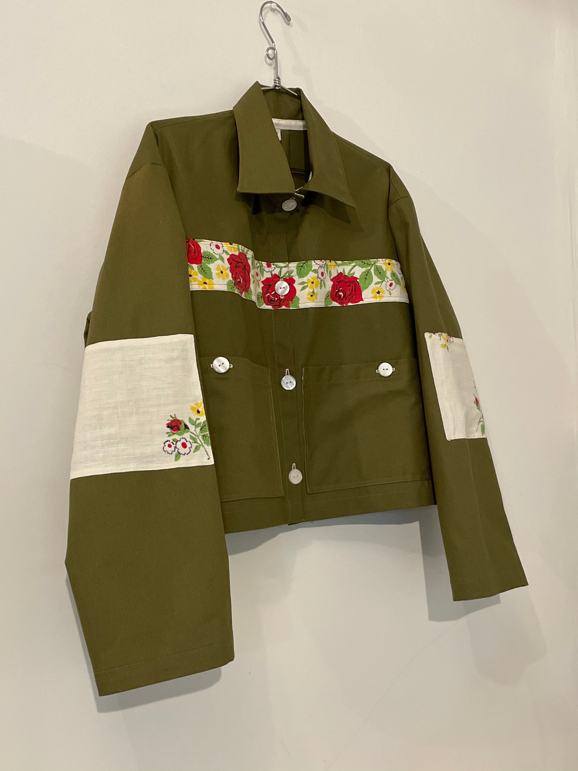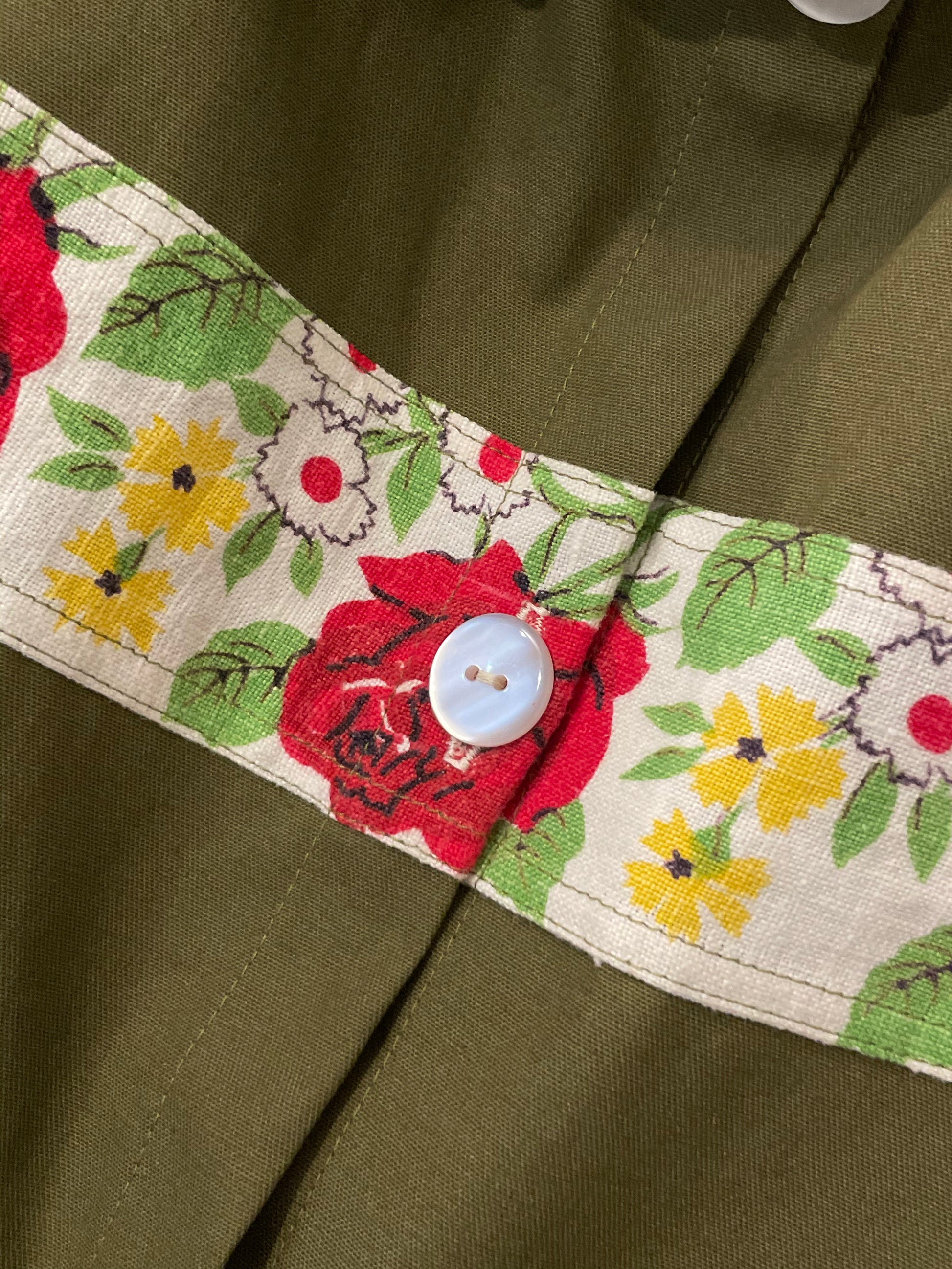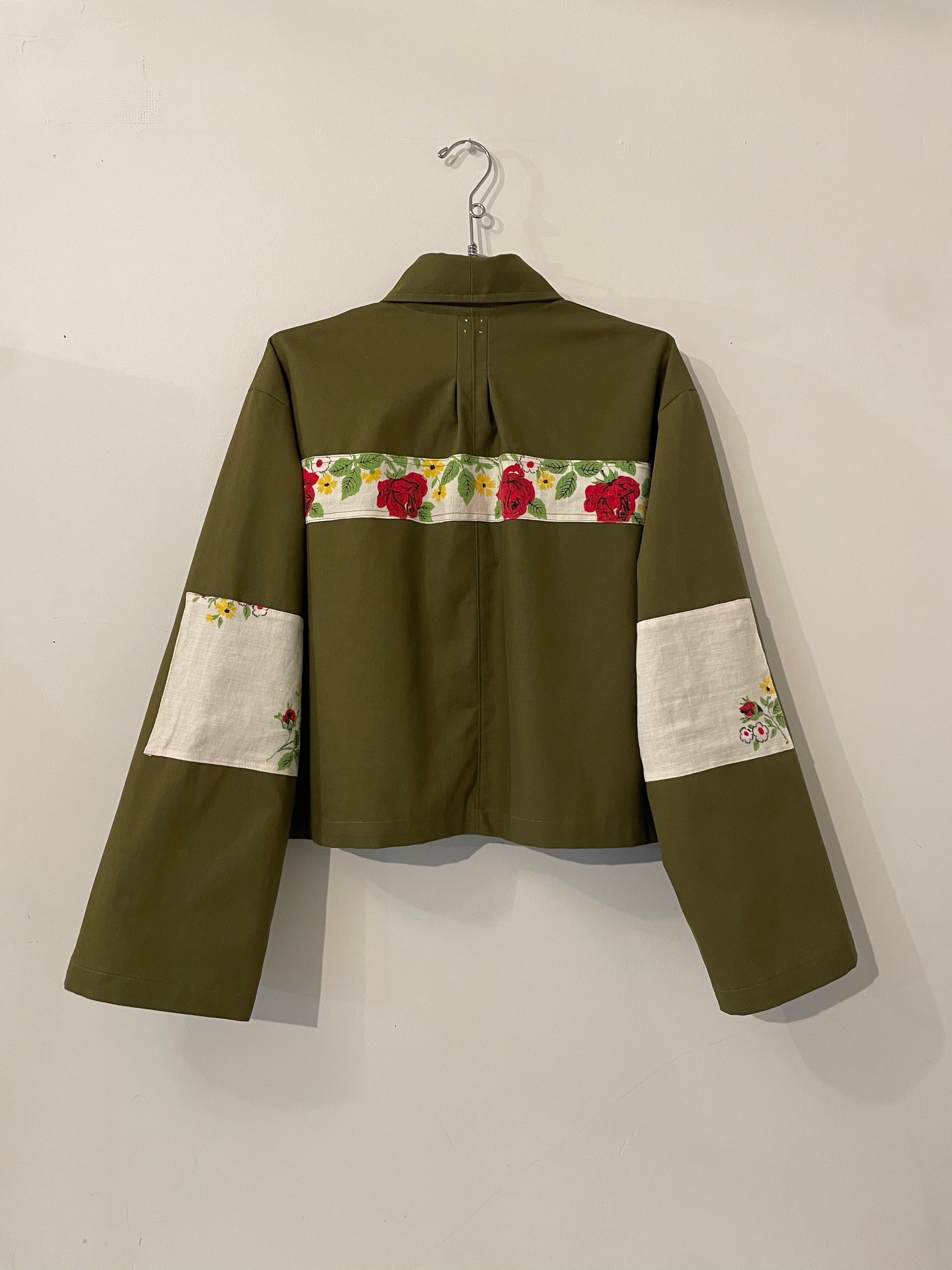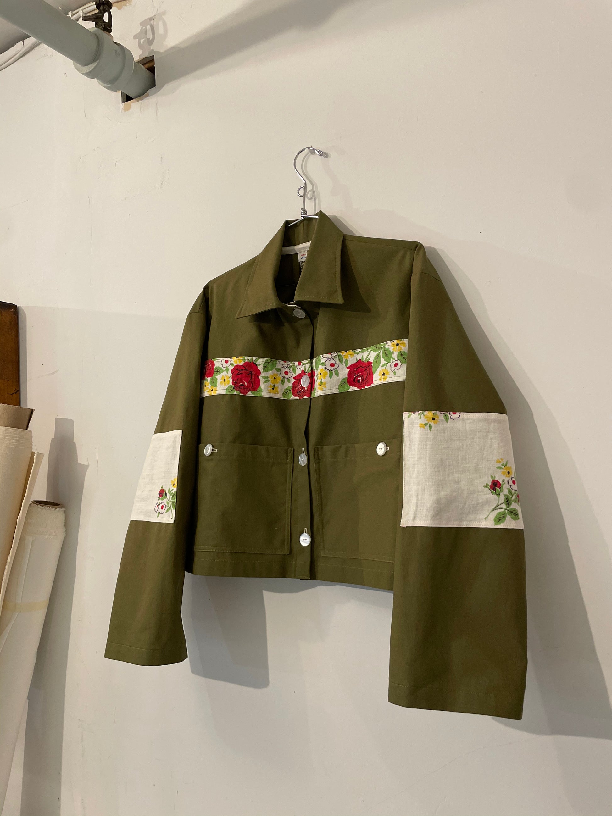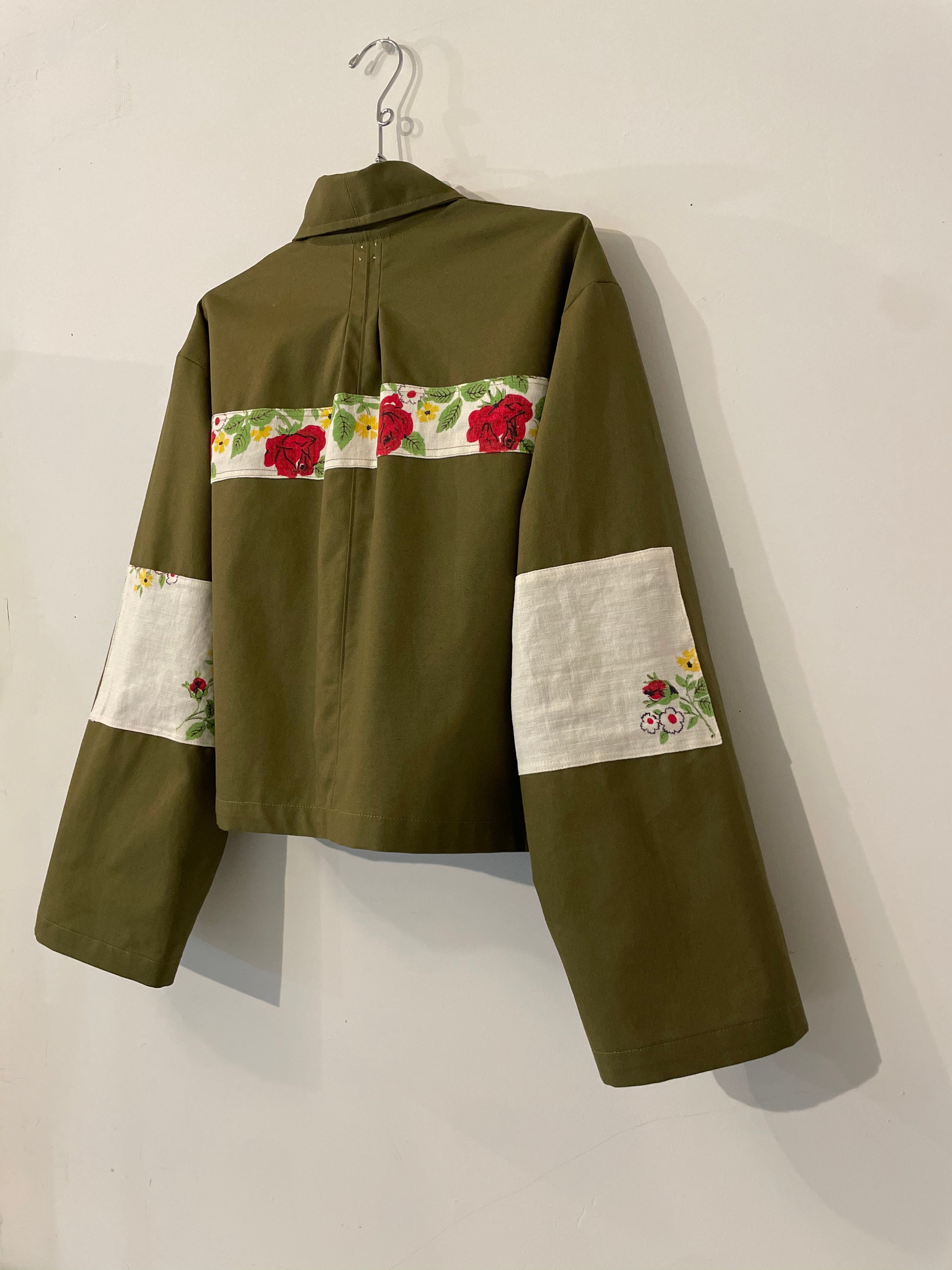 A band of floral printed linen circles the olive cotton jacket on the front and back. This jacket is part of a group of four, where an entire vintage tablecloth was used. Since this tablecloth was well-used, it had stains in some areas. The strips and blocks of fabric were cut carefully around stains to get the most use out of it. On the back of the sleeve are elbow patches, made from the center part of the tablecloth.