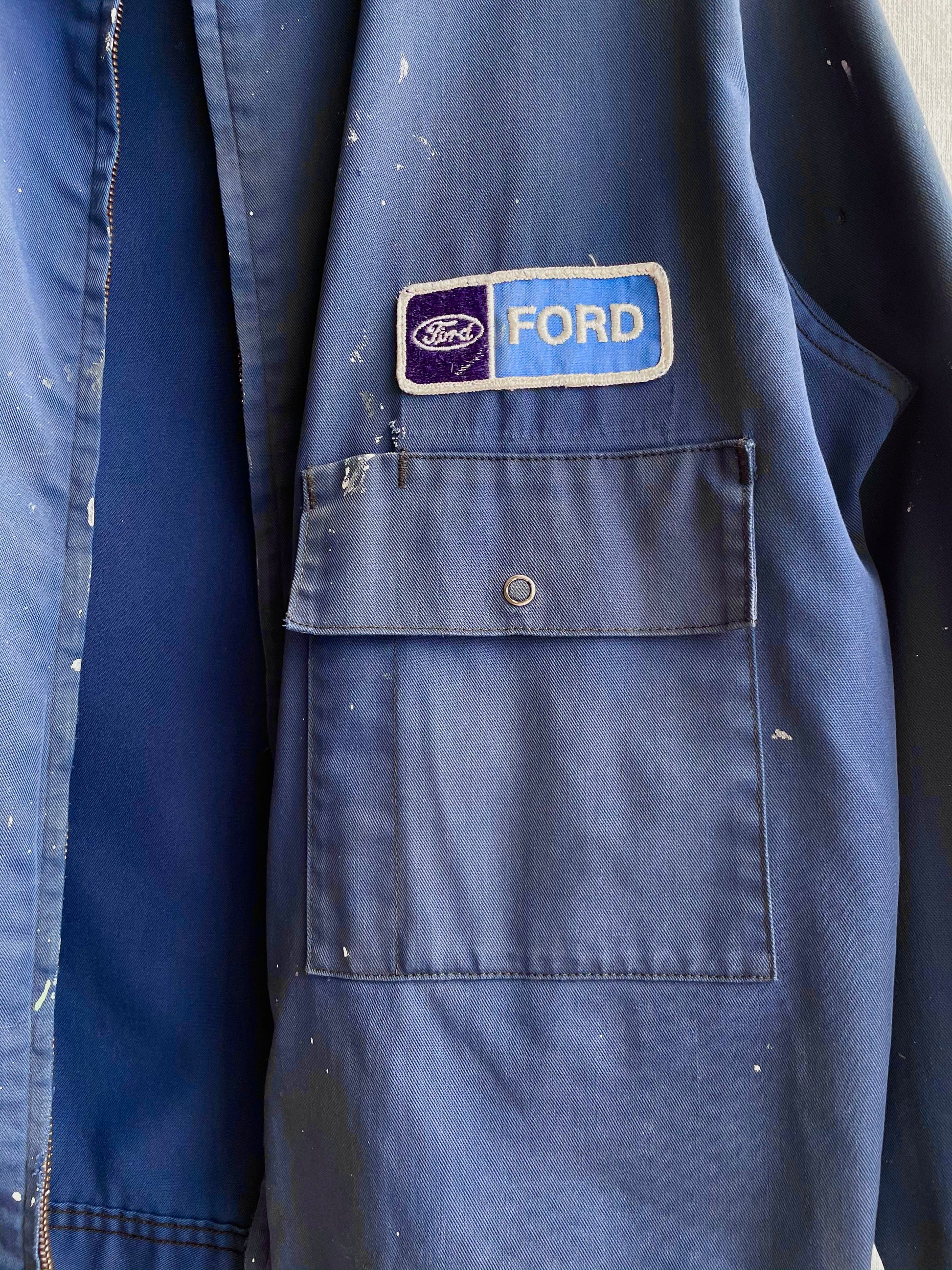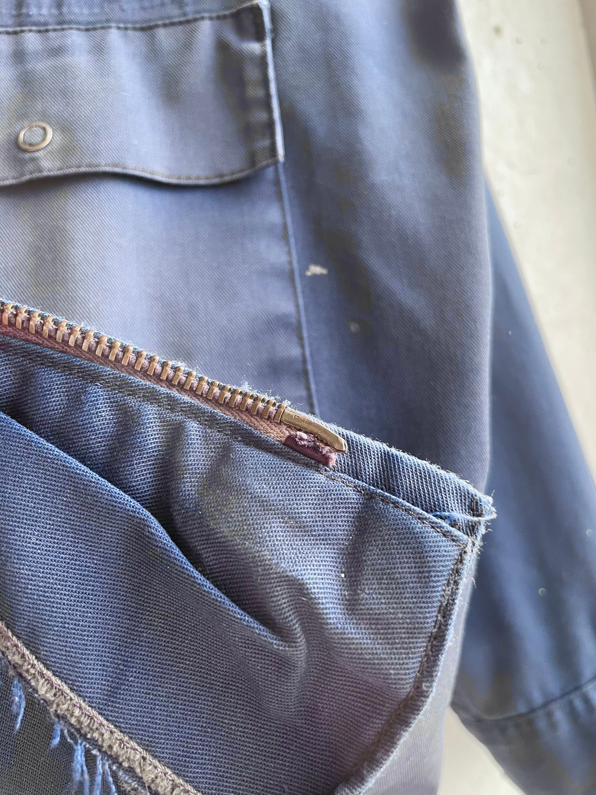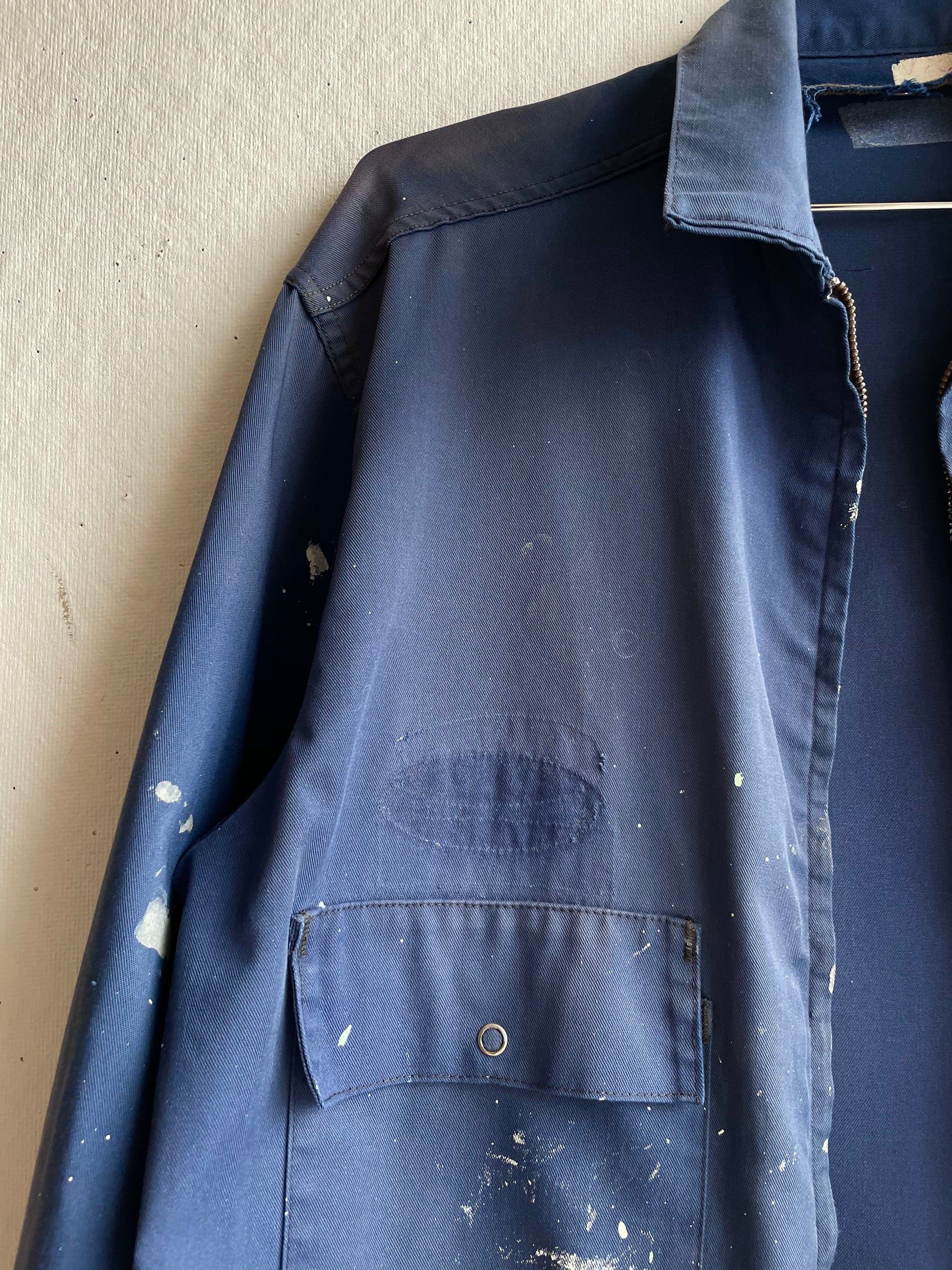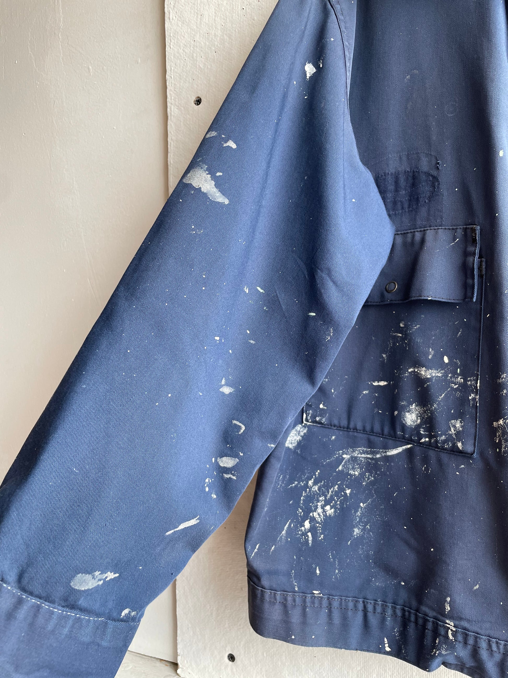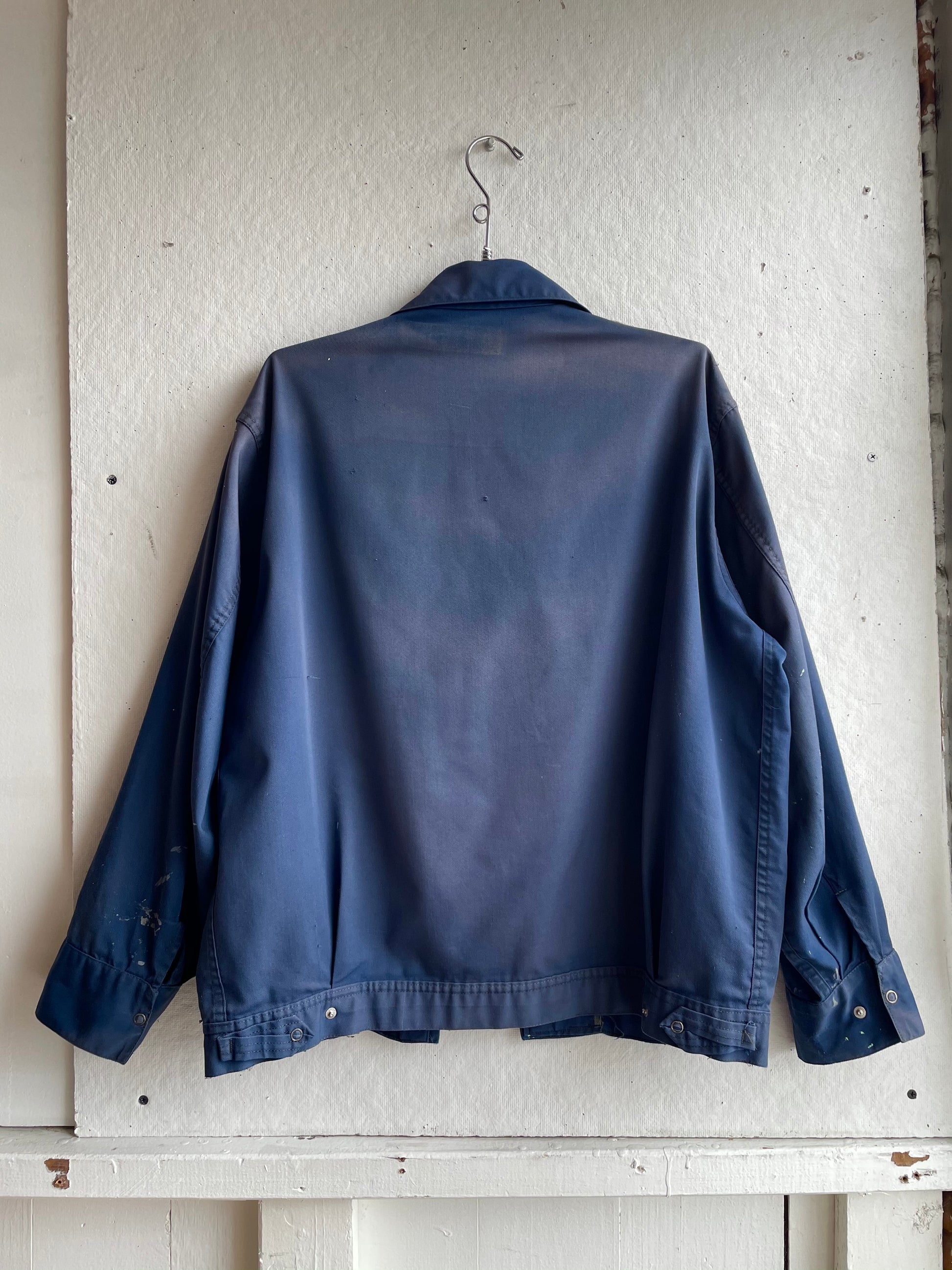Sun-faded navy blue work jacket with great, natural distressing from paint and stitching.  Two front snap pockets and snaps on the sleeve cuffs.