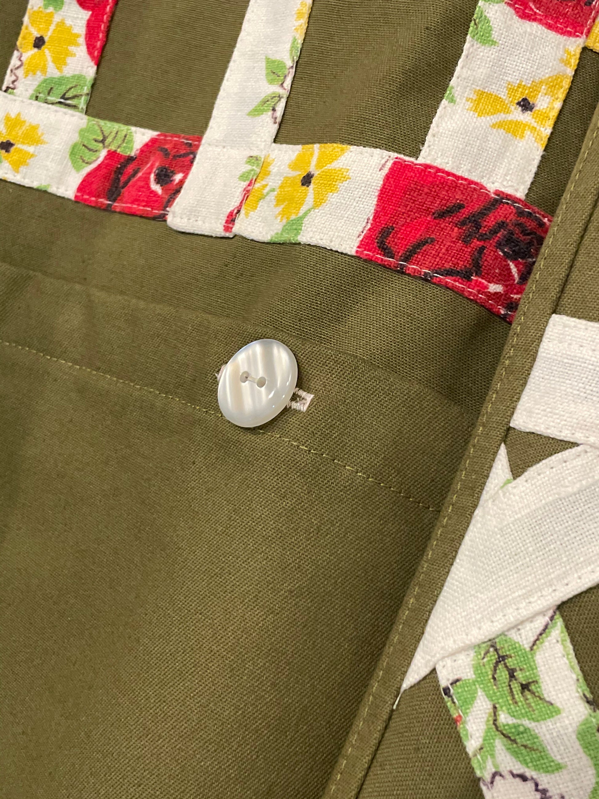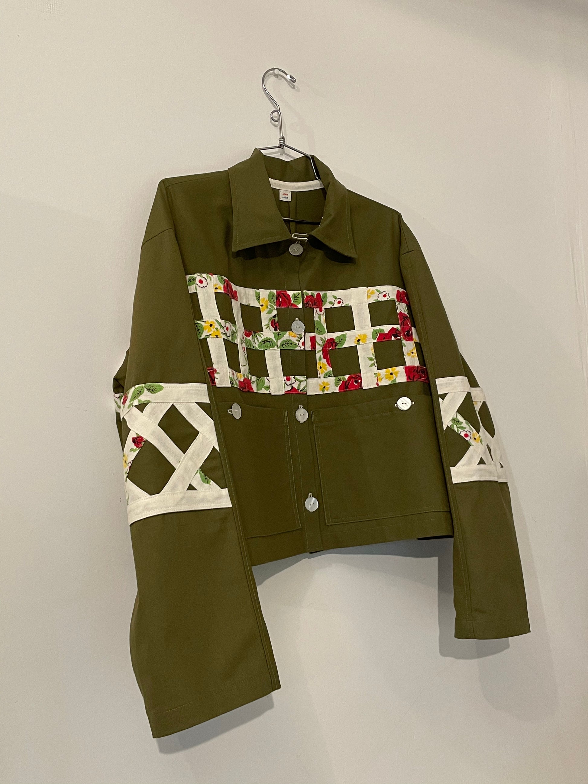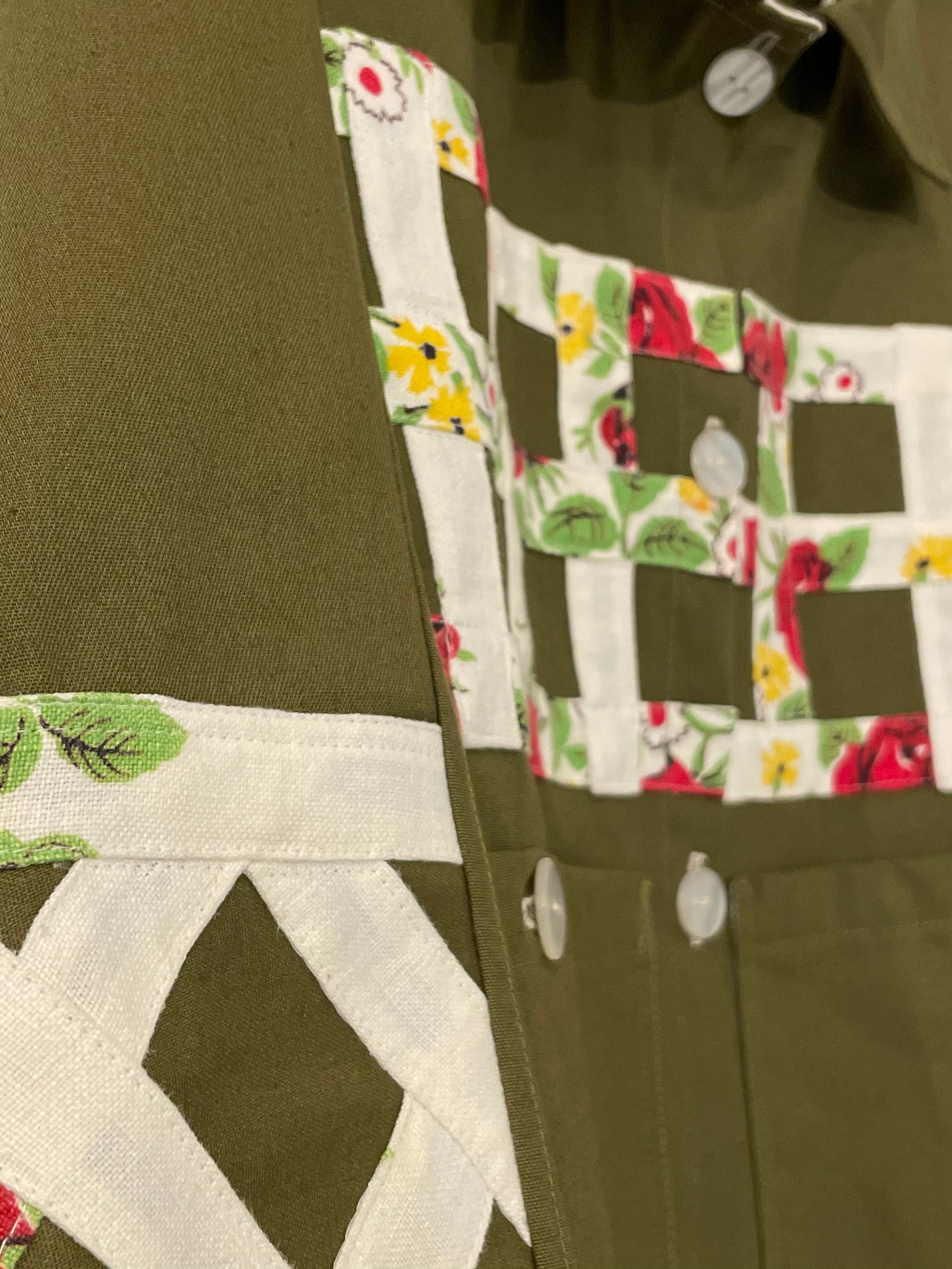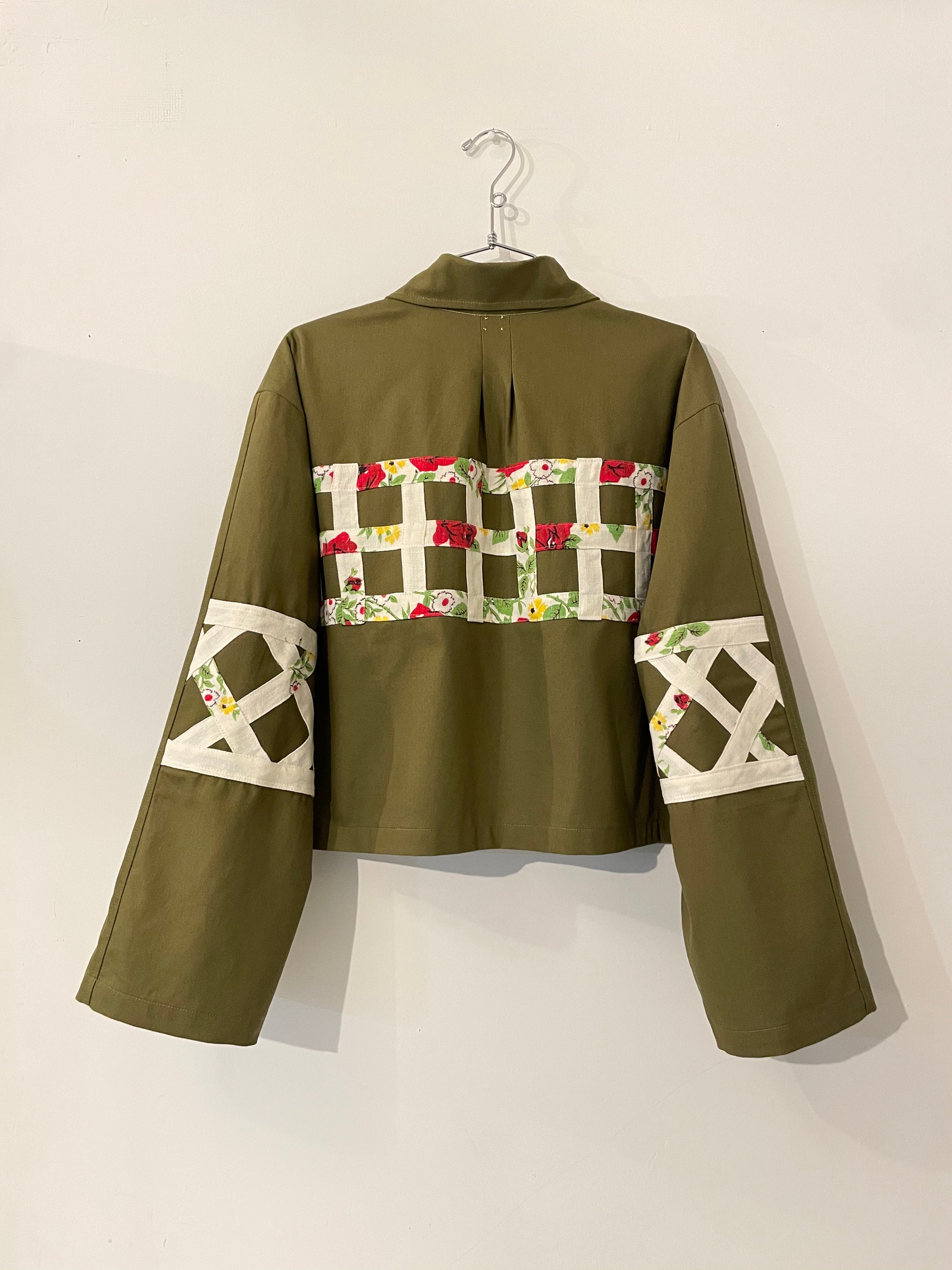 Strips of floral printed linen are woven similarly to a garden lattice on the front, back and elbow patches. This jacket is part of a group of four, where an entire vintage tablecloth was used. Since this tablecloth was well-used, it had stains in some areas. The strips and blocks of fabric were cut carefully around stains to get the most use out of it. The back of the sleeve are elbow patches, which are mostly made from the center part of the tablecloth, where there was a spaced out pattern. Most of the front and back pieces came from the beautiful, lush border of the tablecloth.