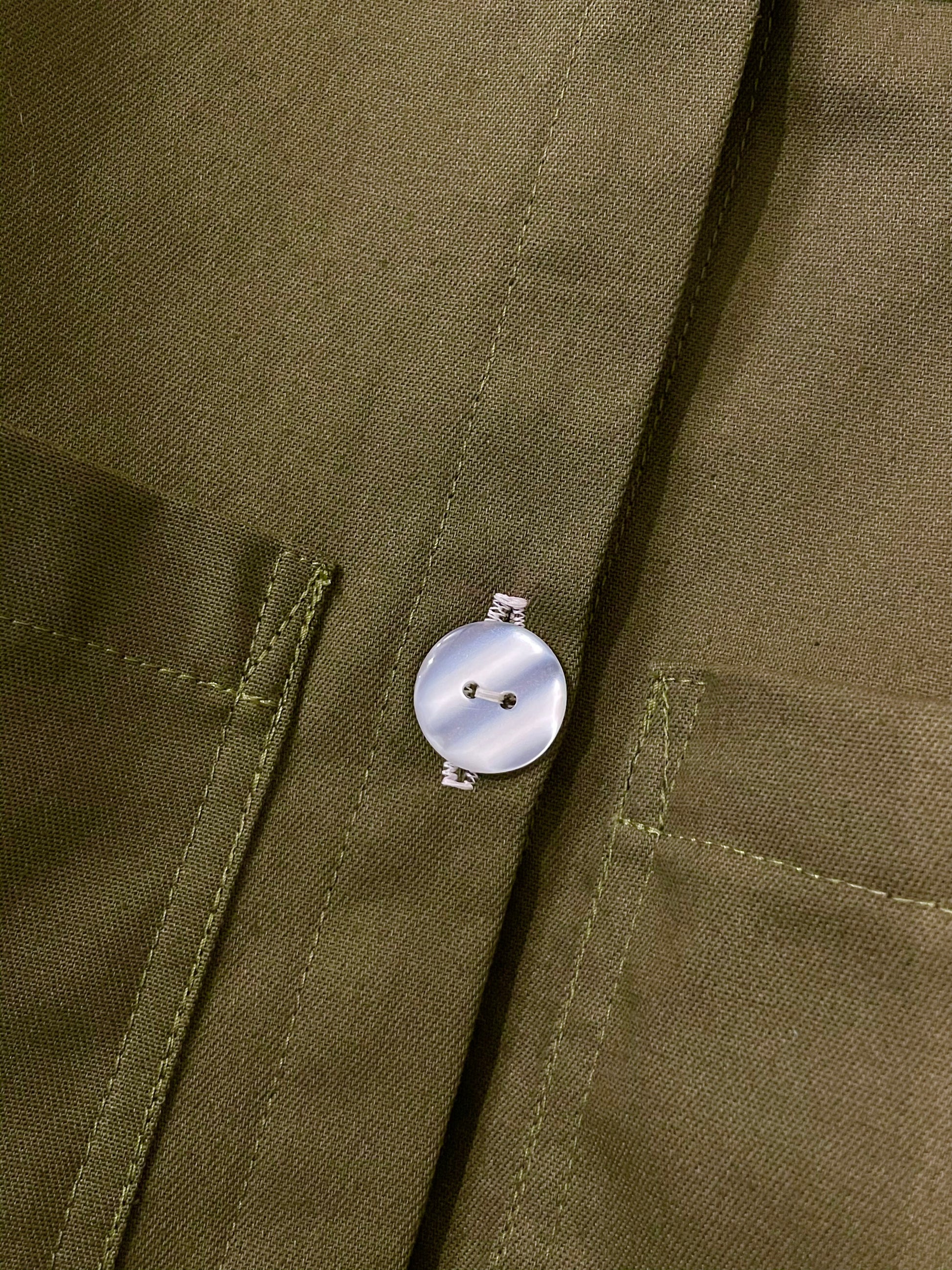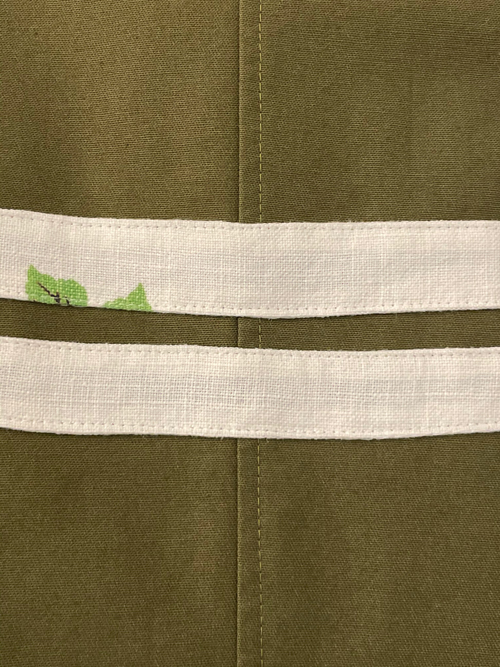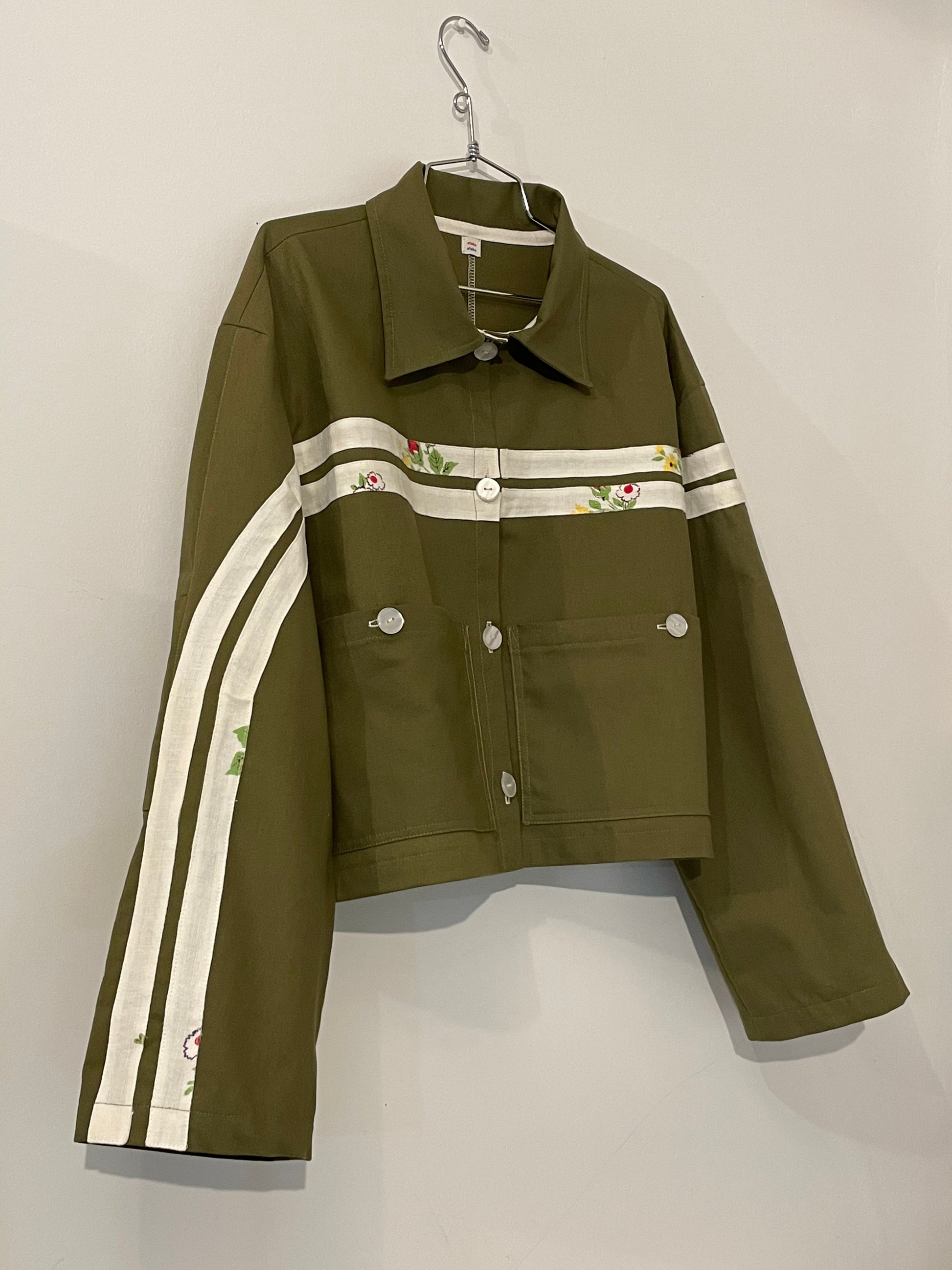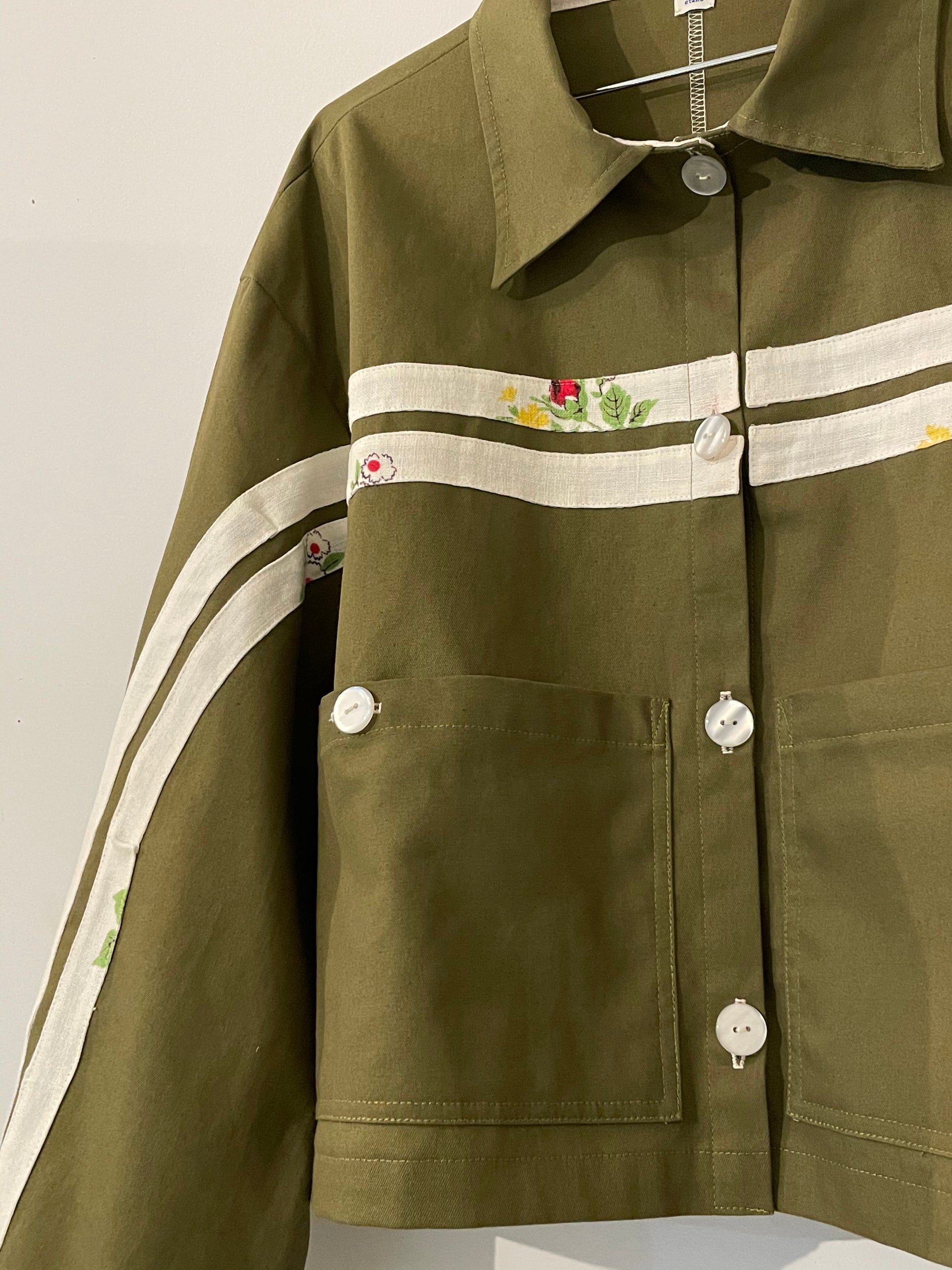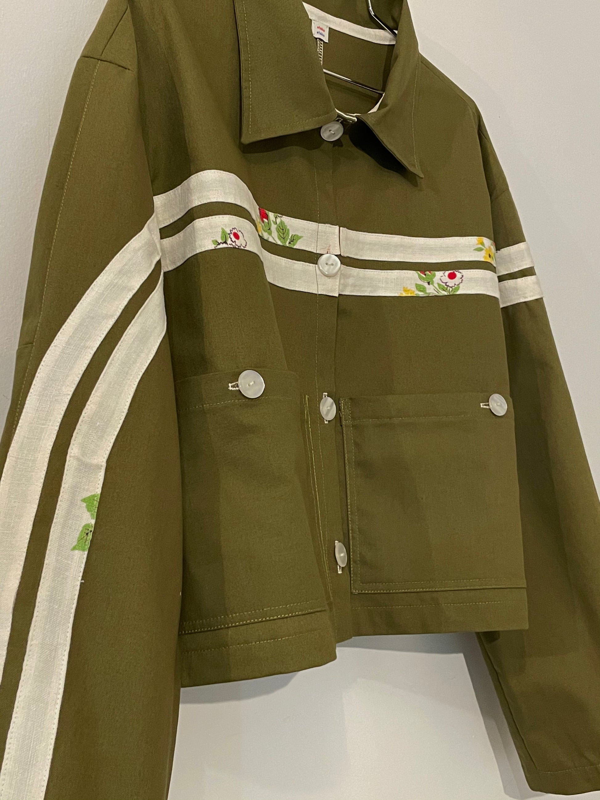 Stripes, formed from strips of floral printed linen, come up the arm and wrap around the body. Has a slight motorcycle jacket feel to it. This is part of a group of four jackets, where an entire vintage tablecloth was used. Since this tablecloth was well-used, it had stains in some areas. The strips and blocks of fabric were cut carefully around stains to get the most use out of it. On this piece, they were mainly from the center of the tablecloth.