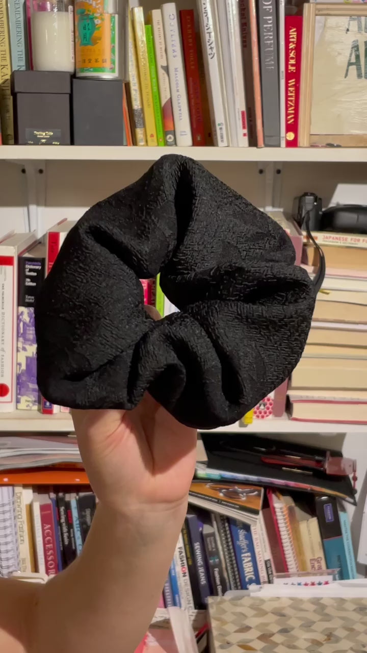 Made from a black jacquard fabric, this scrunchie has an all over rose motif. This bigger size looks really good in a ponytail or half up hair style. To achieve a more secured hairstyle, this comes with two complimentary hair ties.