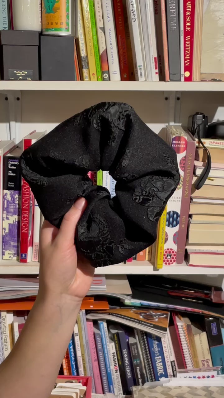 Made from a black jacquard fabric, this scrunchie has an all over rose motif. This bigger size looks really good in a ponytail or half up hair style. To achieve a more secured hairstyle, this comes with two complimentary hair ties.