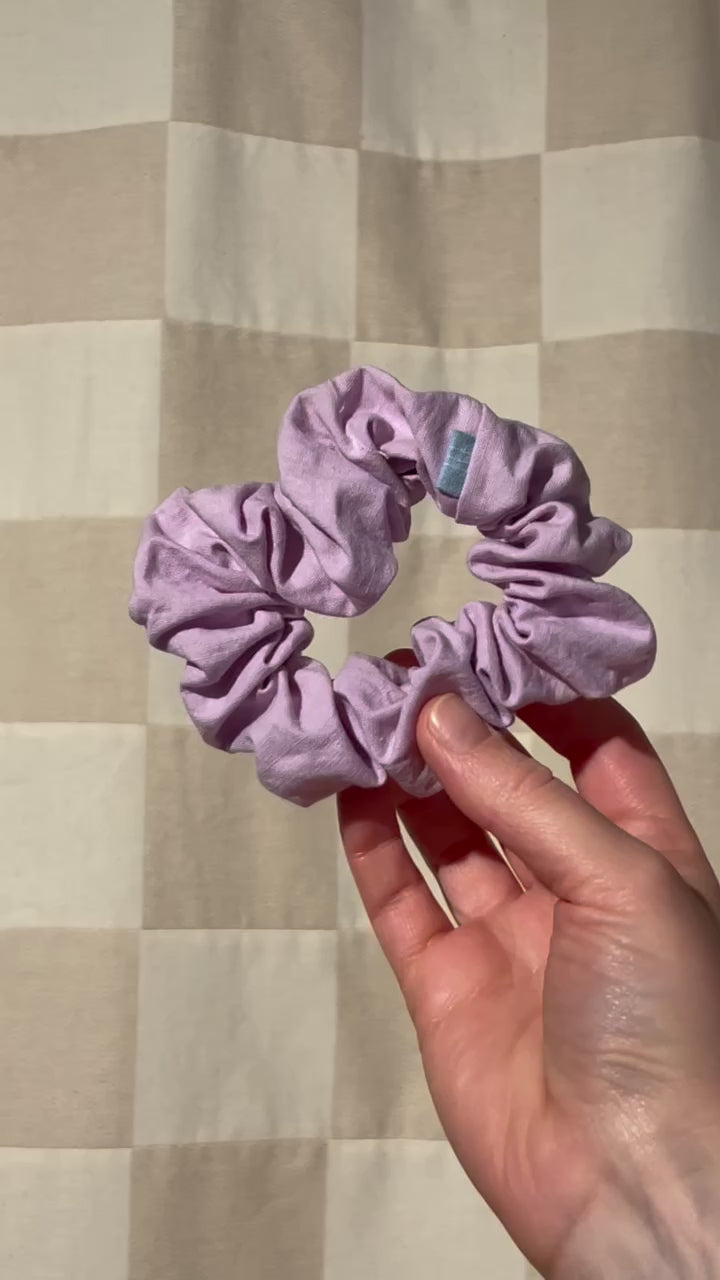 Made from vintage, packaged bed sheets, this scrunchie has a cute lilac color.  This size is perfect for a bun, and comes with two complimentary hair ties, for a two-step, super secure hair style.