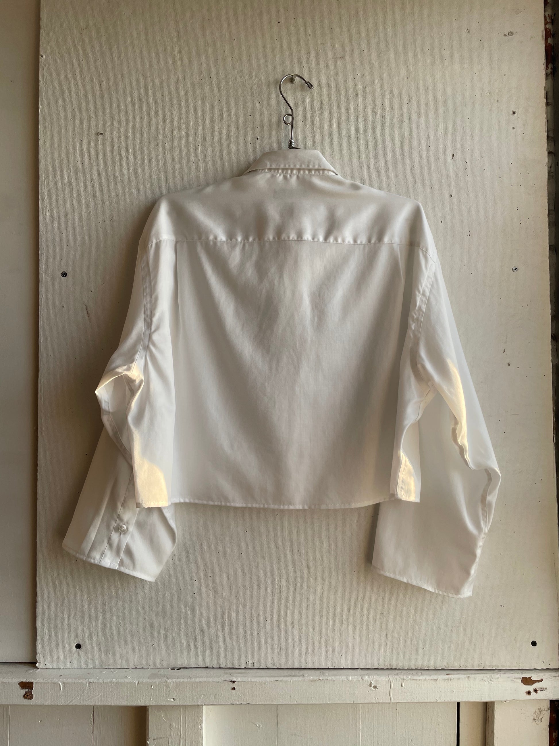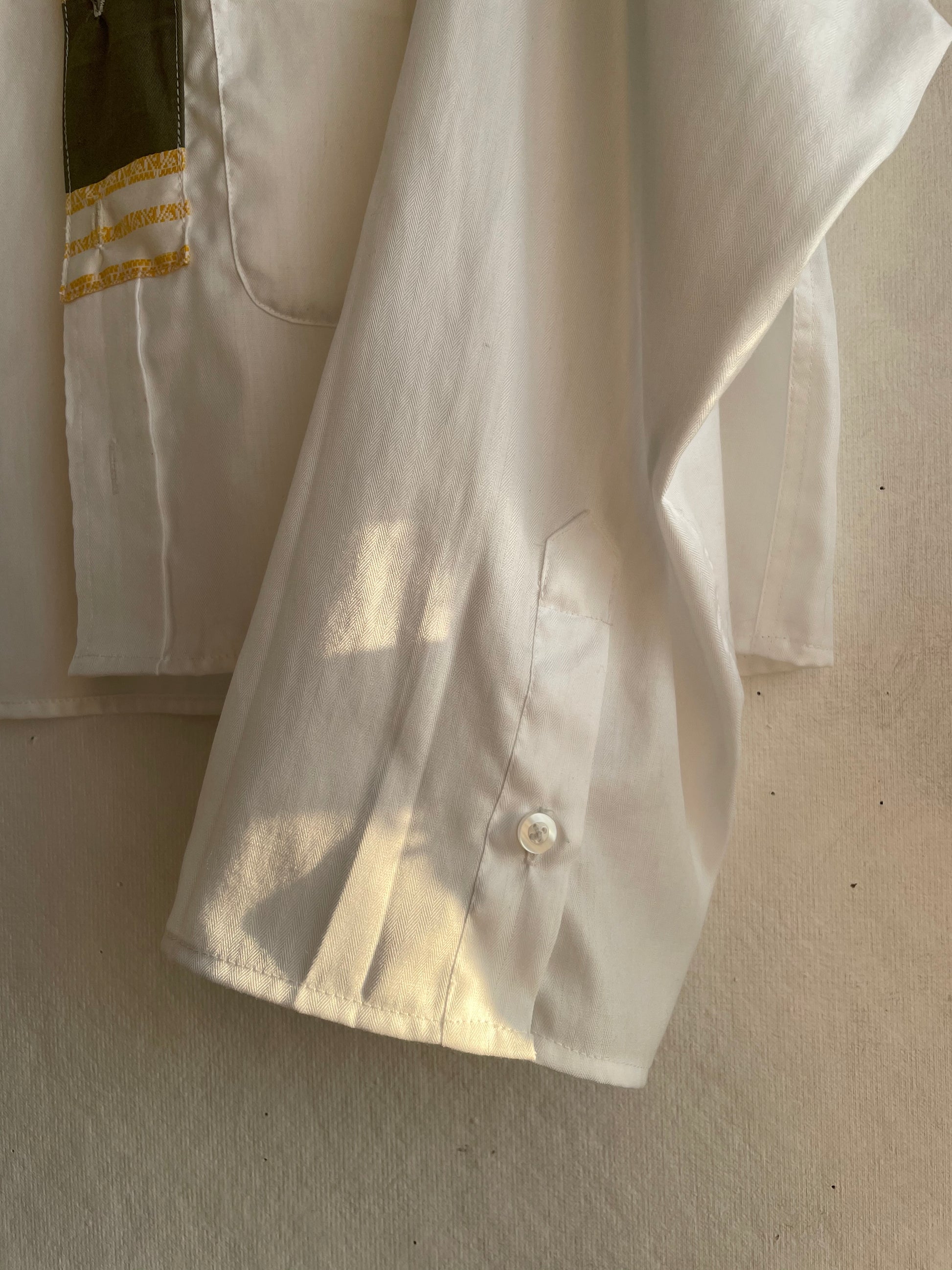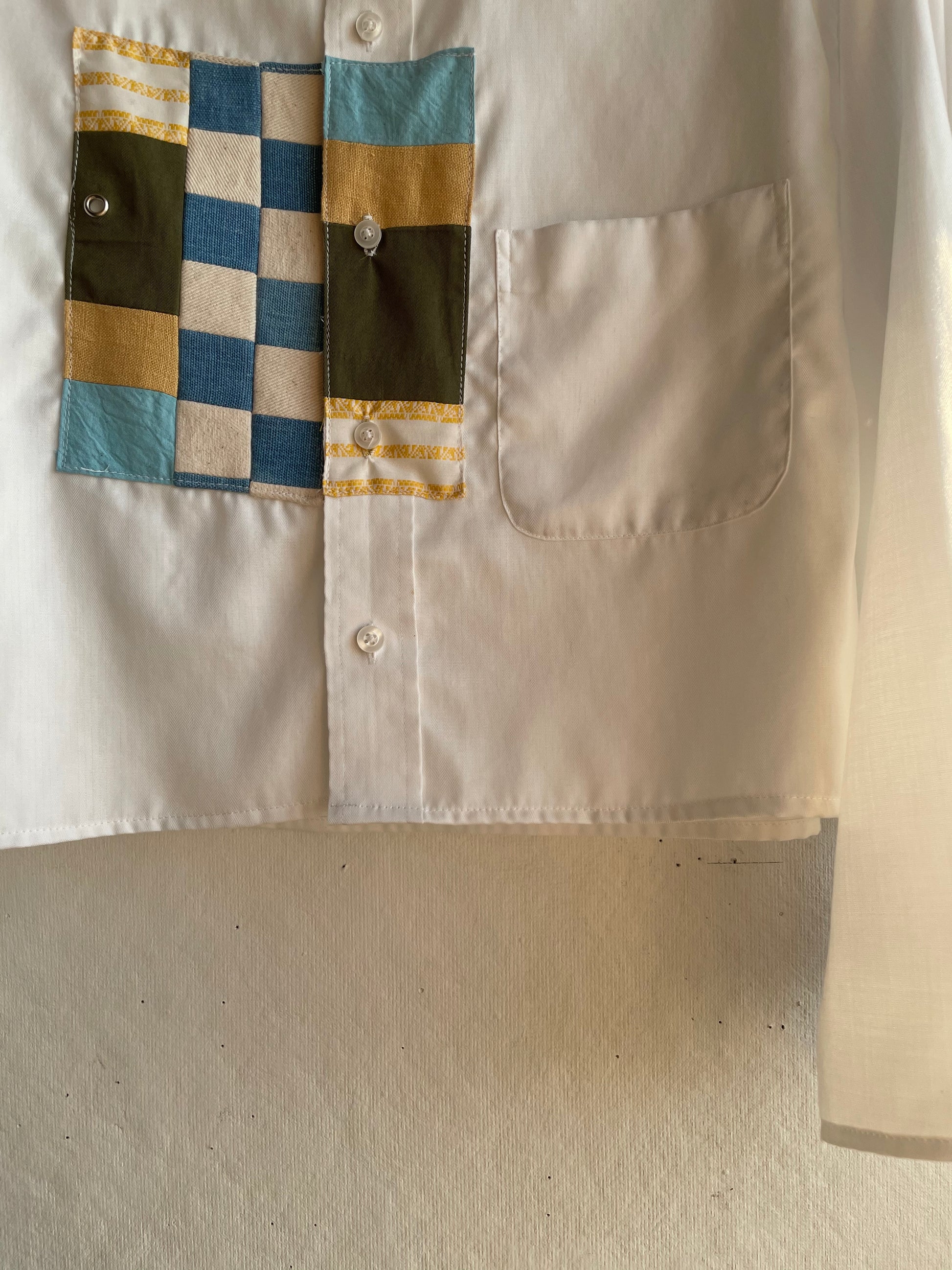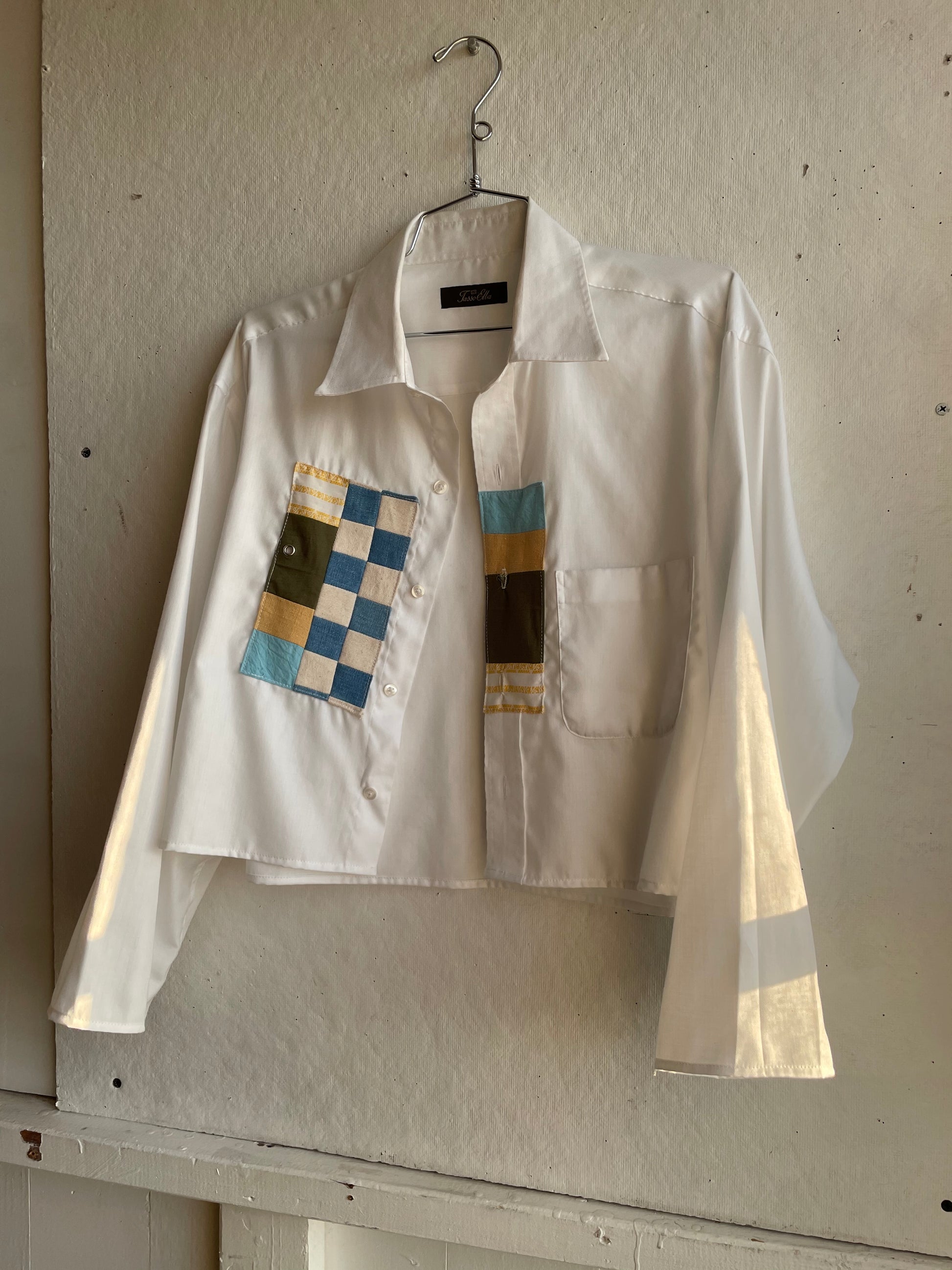 Second-hand long sleeve shirt, that’s been cropped at the sleeves and the bottom hem, with a quilted block sewn onto the front. This patchwork block is different scraps that were saved from various projects and each have their own story.