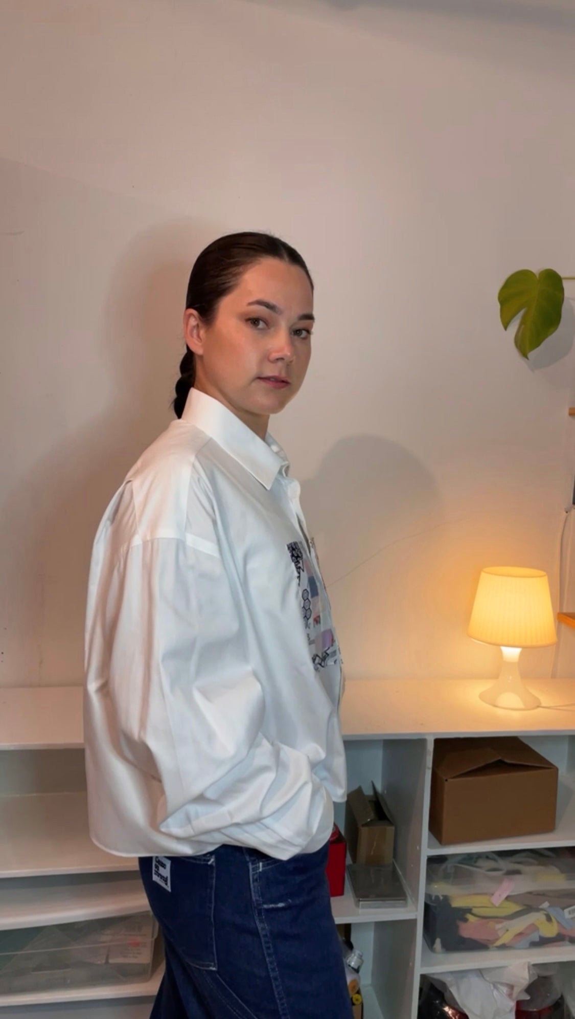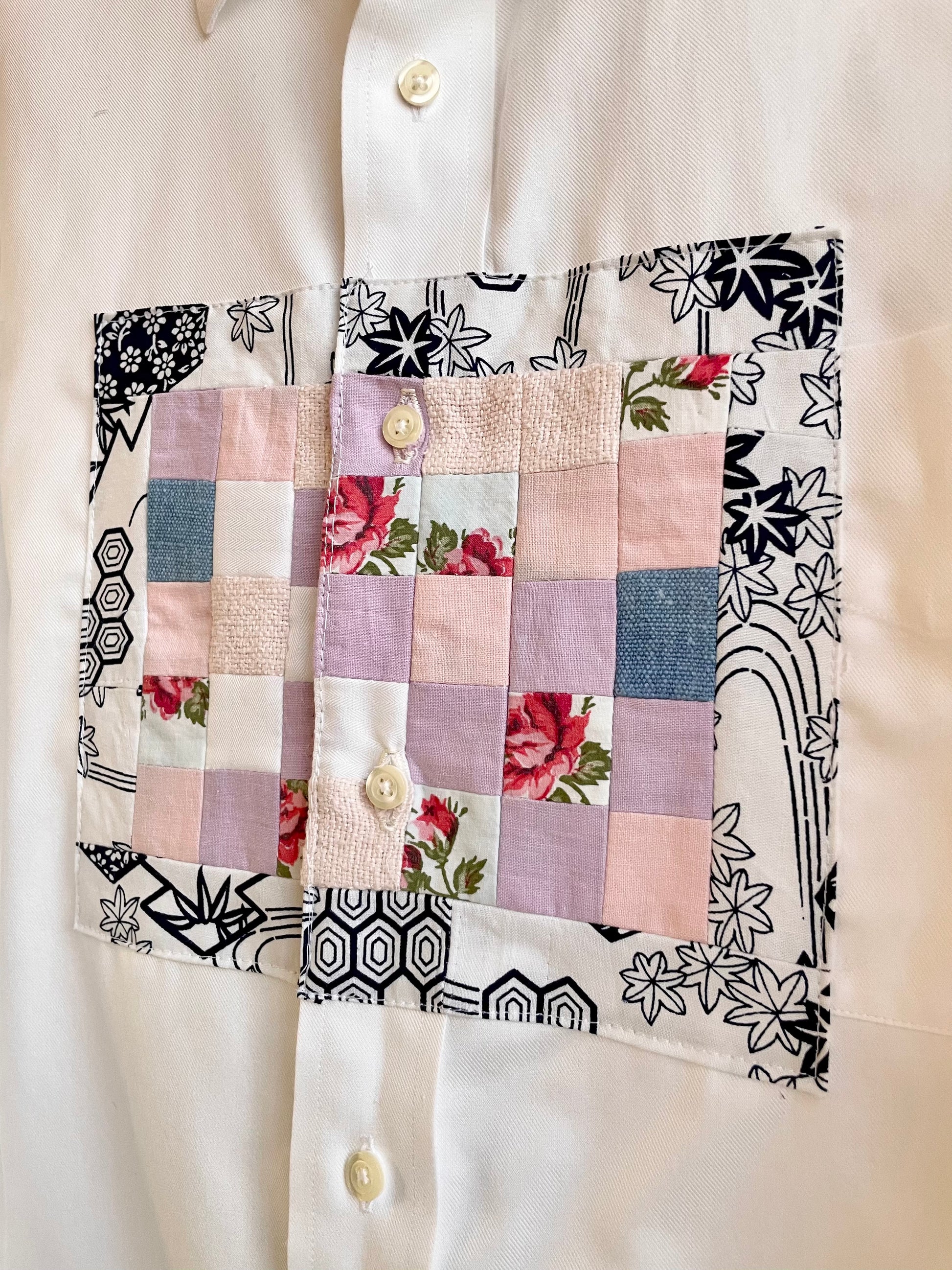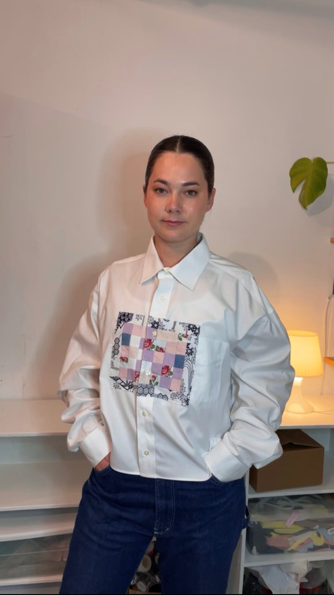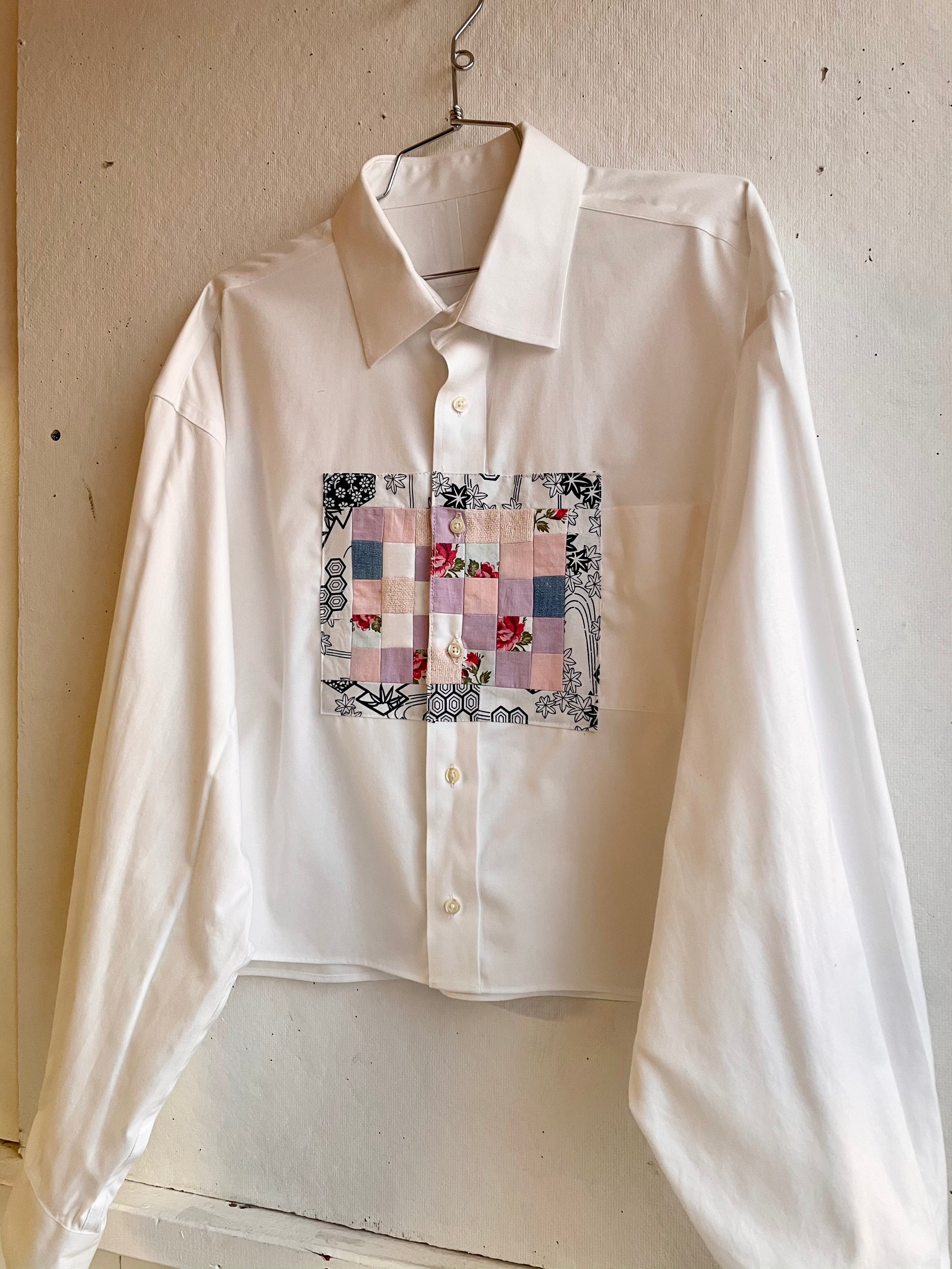 Second-hand long sleeve shirt, that’s been cropped at the sleeves and the bottom hem, with a quilted block sewn onto the front. This patchwork block is different scraps that were saved from various projects and each have their own story.