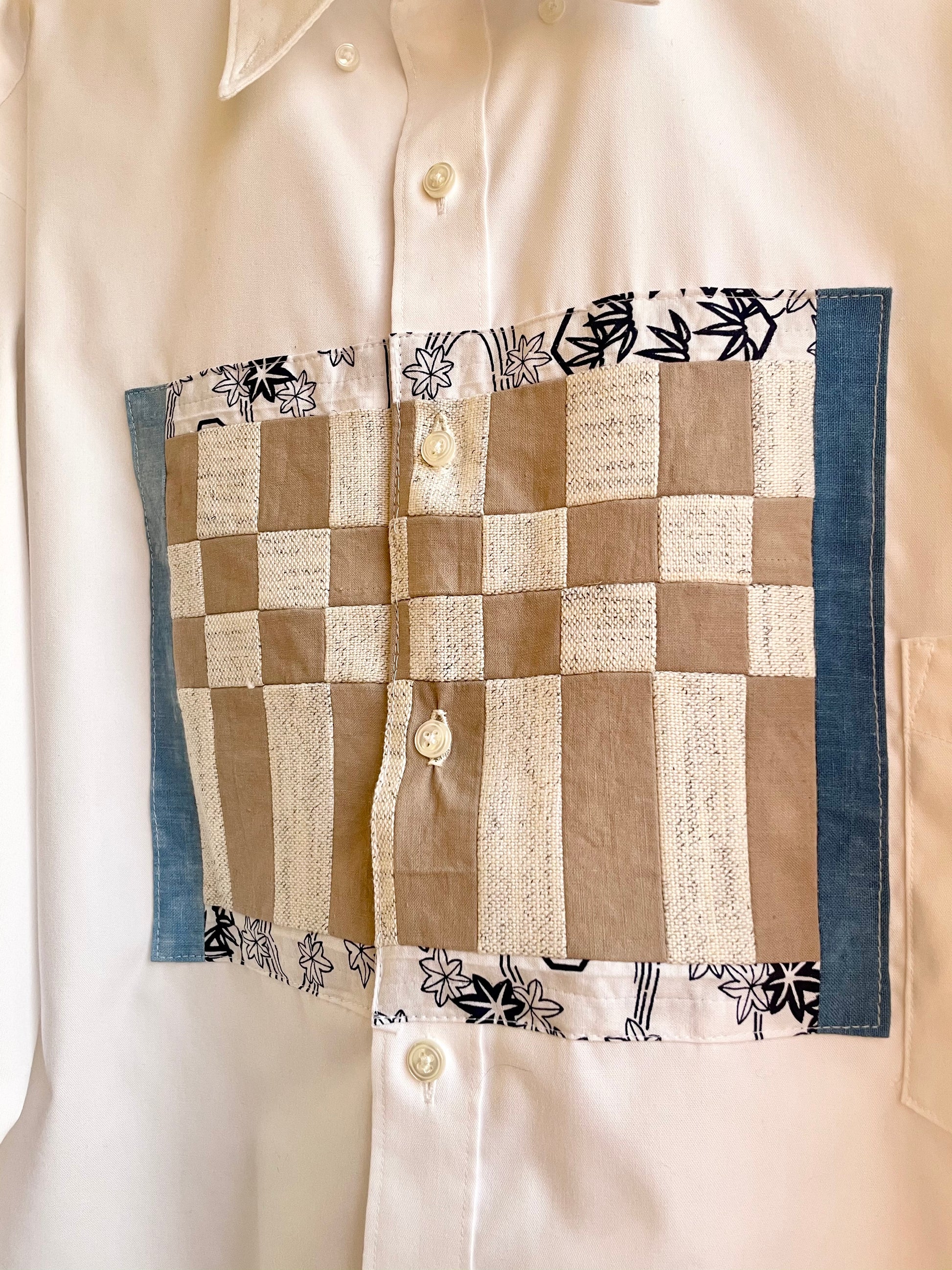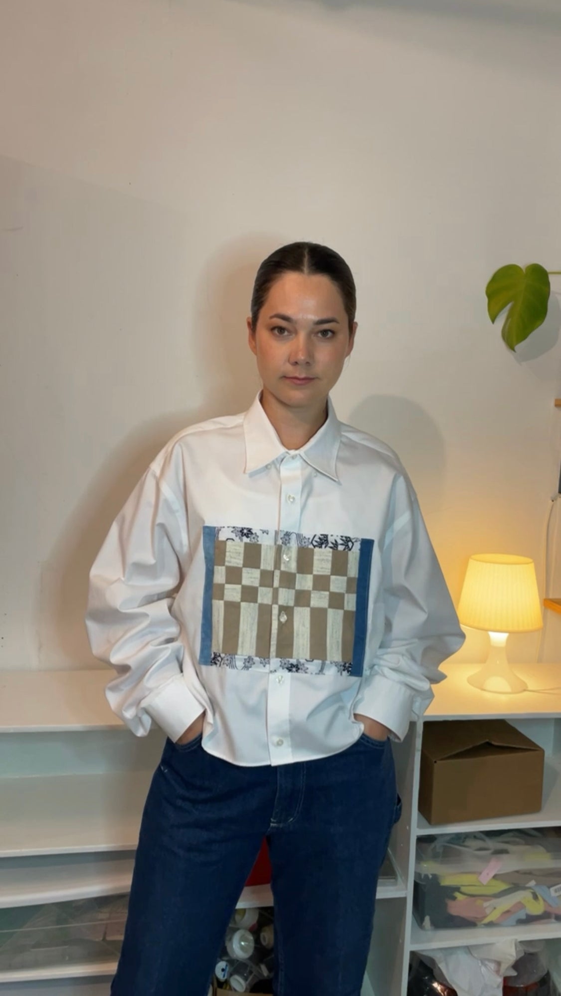 Second-hand long sleeve shirt, that’s been cropped at the sleeves and the bottom hem, with a quilted block sewn onto the front. This patchwork block is different scraps that were saved from various projects and each have their own story.