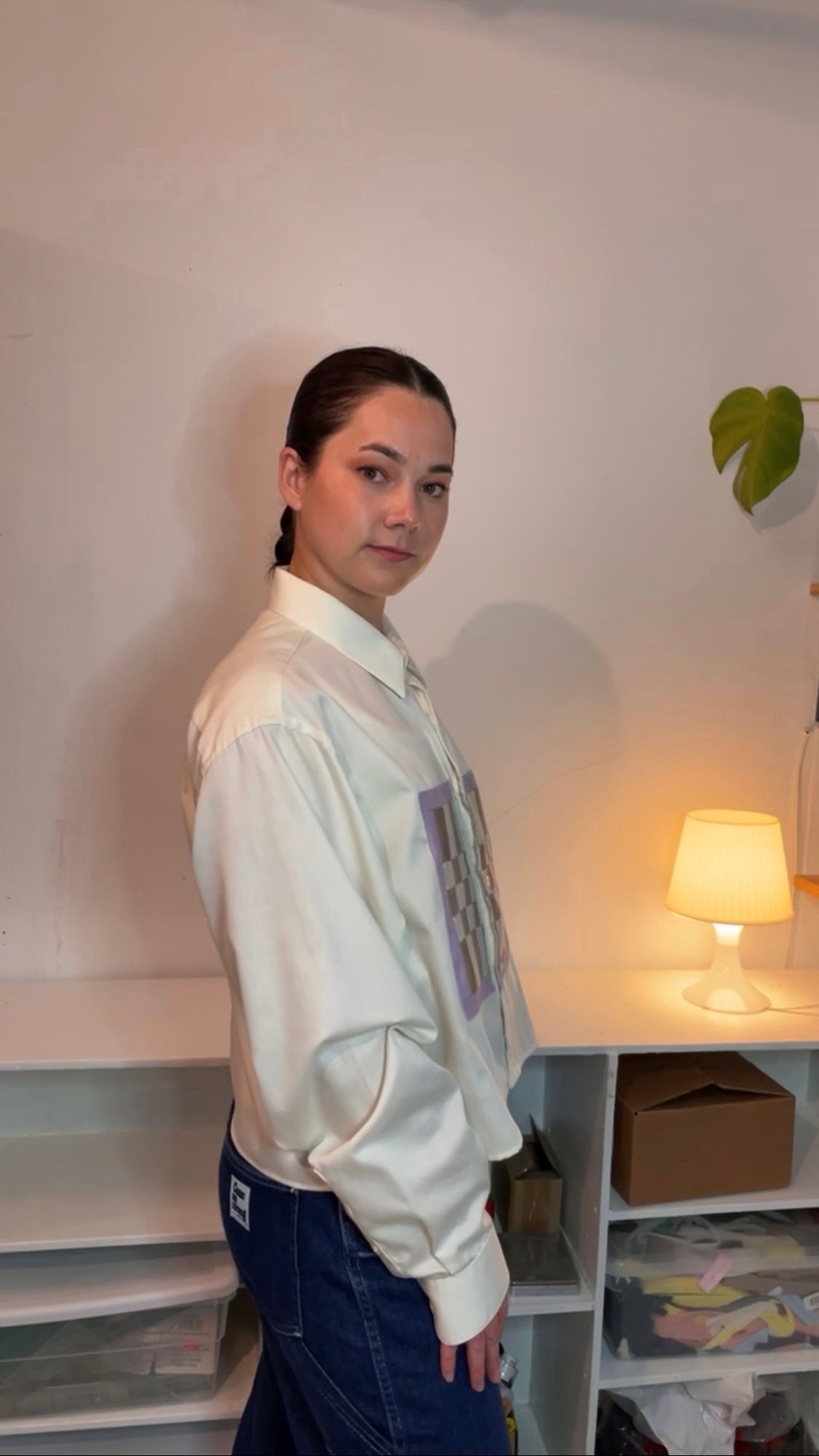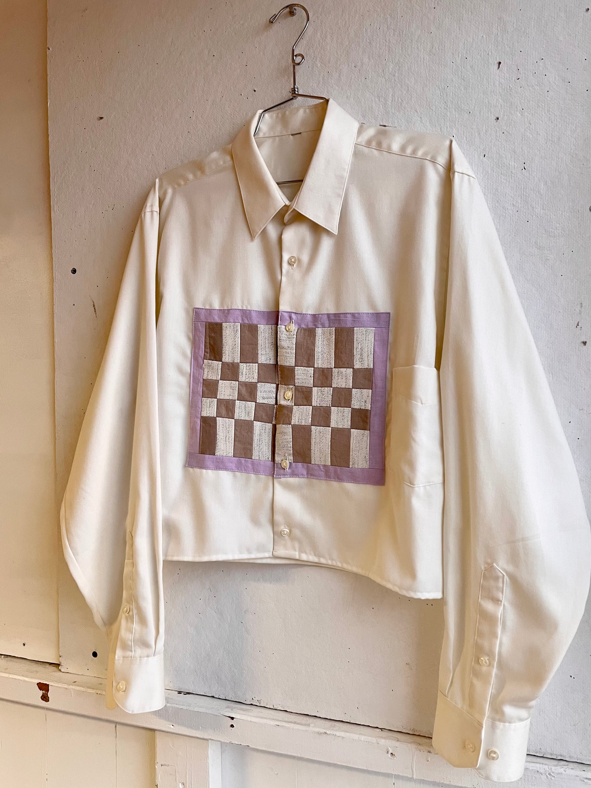 Second-hand long sleeve shirt, that’s been cropped at the sleeves and the bottom hem, with a quilted block sewn onto the front. This patchwork block is different scraps that were saved from various projects and each have their own story.