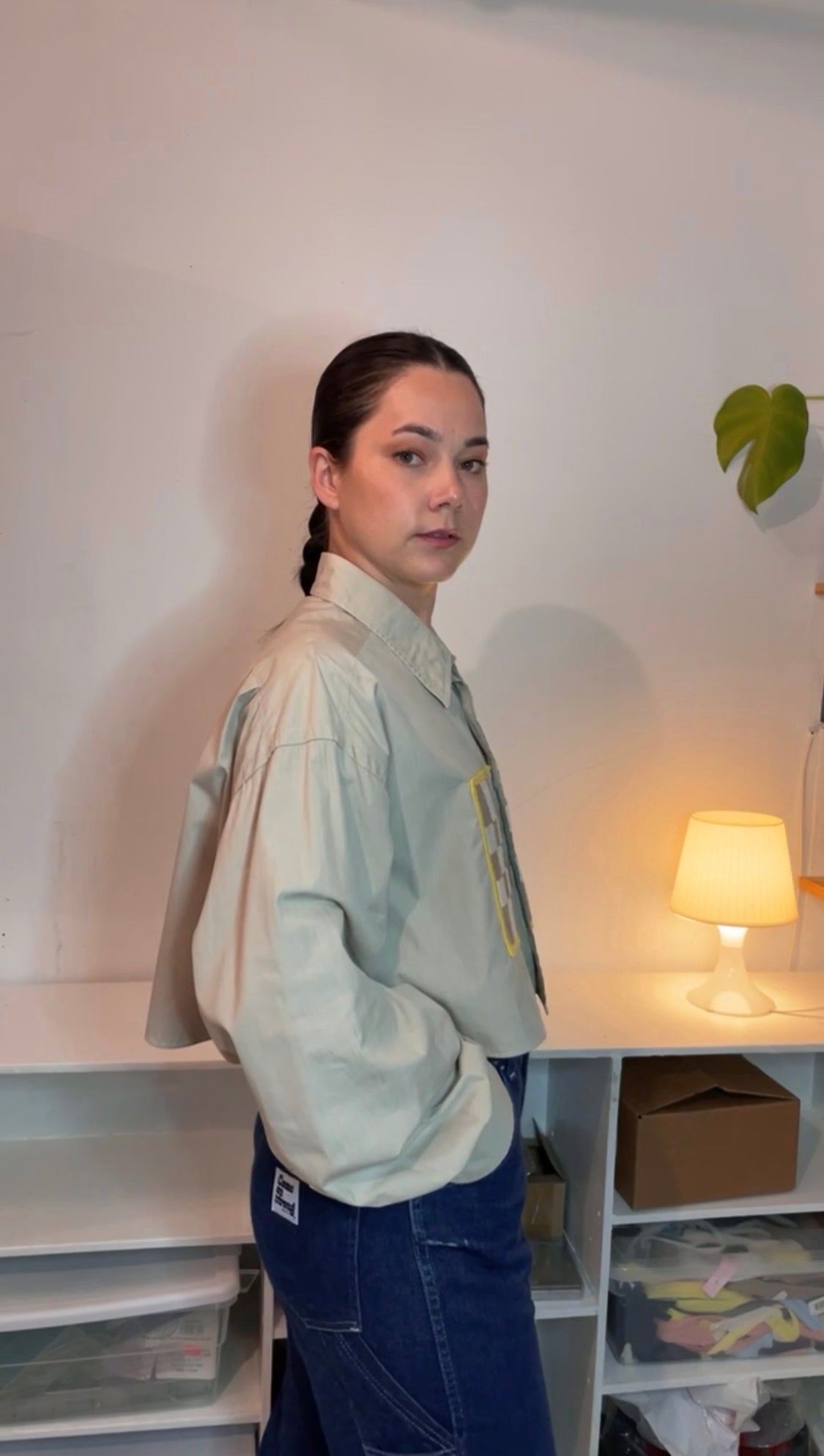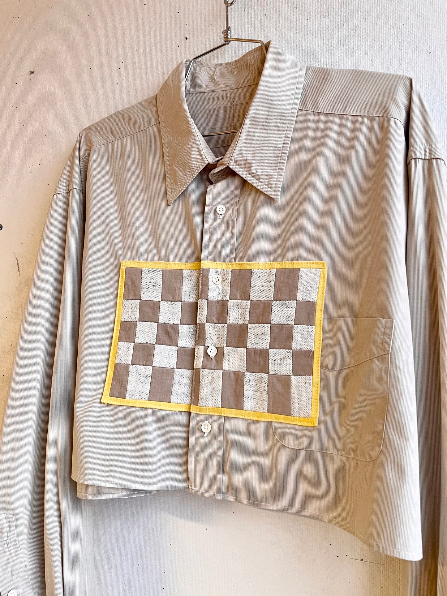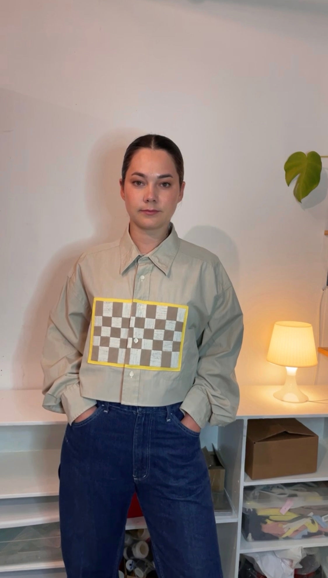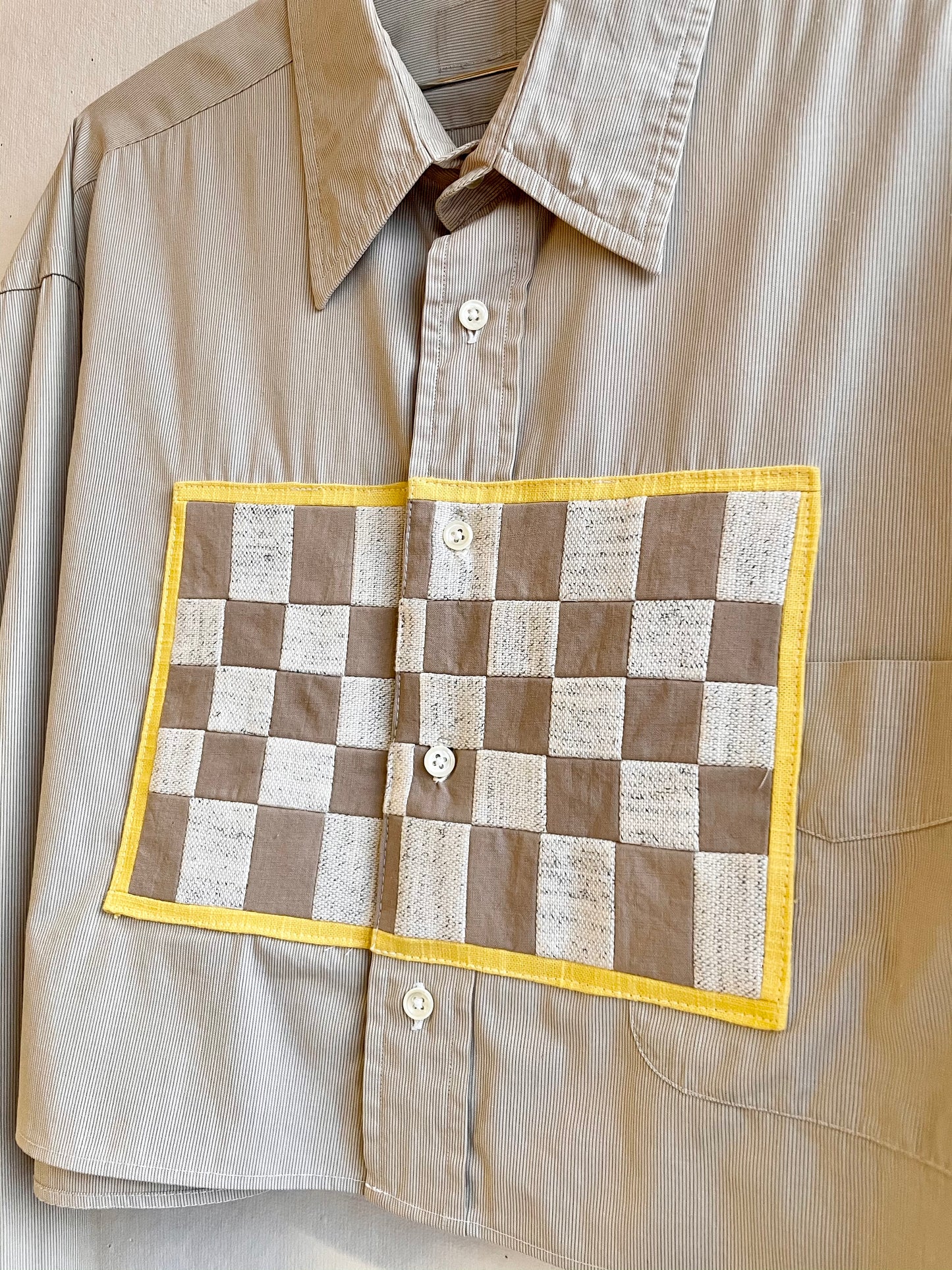 Second-hand long sleeve shirt, that’s been cropped at the sleeves and the bottom hem, with a quilted block sewn onto the front. This patchwork block is different scraps that were saved from various projects and each have their own story.